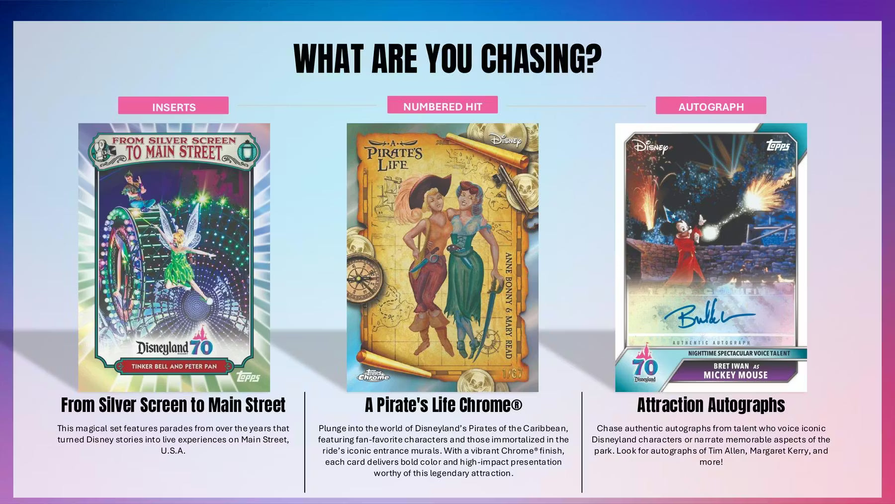 Commemorate 70 years of The Happiest Place on Earth with 2025 Topps Disneyland 70th Anniversary, a trading card product celebrating Disneyland's rich history of attractions, characters, cast members, and more! Chase autographs, sketches, relics, and even a grand prize trip to Disneyland in this truly magical collecting experience.